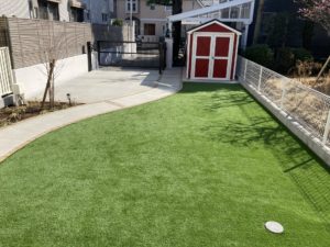柔らかく上品な質感の人工芝は、ペットが安心して遊べる快適なスペースを創出します。一年を通して鮮やかな緑を保ち、景観の美しさとメンテナンス性を両立した、洗練された庭の表情を演出します。